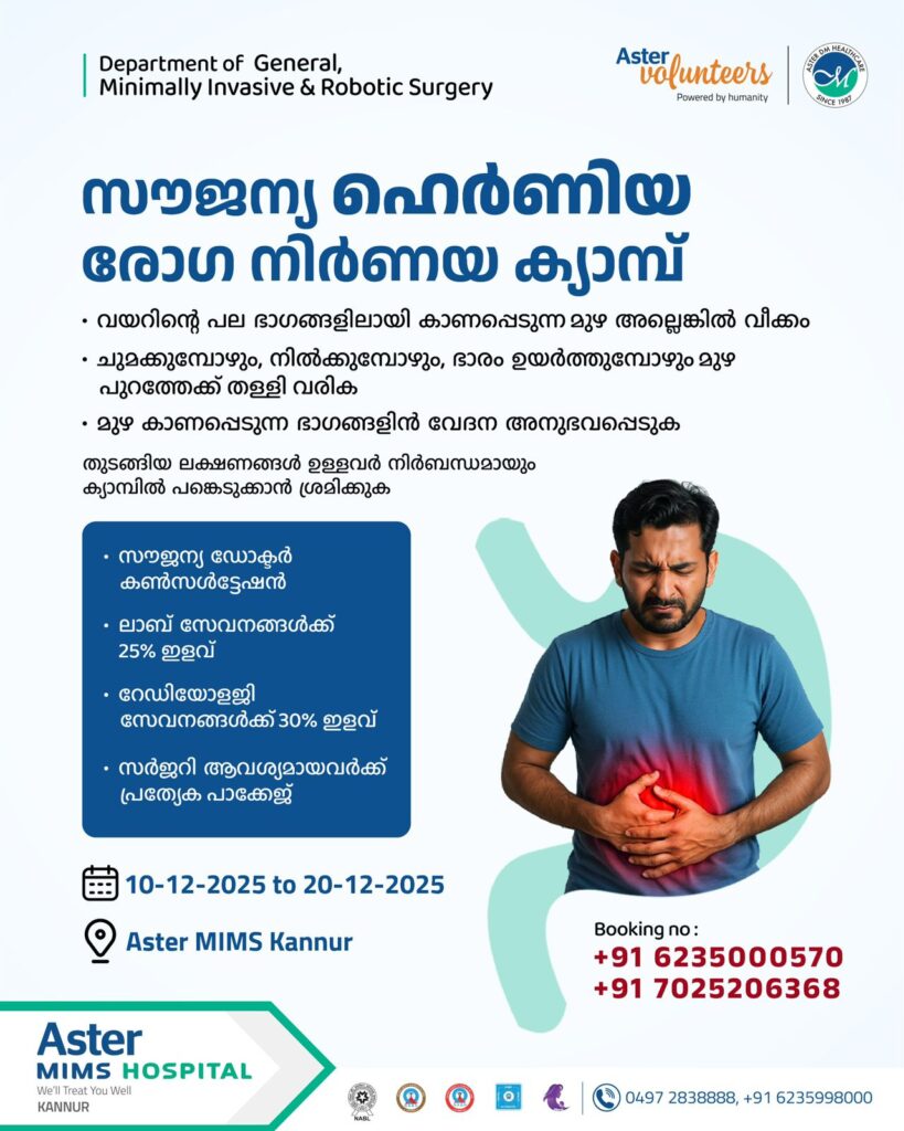 ഹെര്ണിയ രോഗനിര്ണയത്തിന് കൂടുതല് സൗകര്യങ്ങള് ഒരുക്കിക്കൊണ്ടാണ് കണ്ണൂര് ആസ്റ്റര് മിംസില് ഹെര്ണിയ രോഗ നിര്ണയ ക്യാമ്പ് ഒരുക്കുന്നത്.